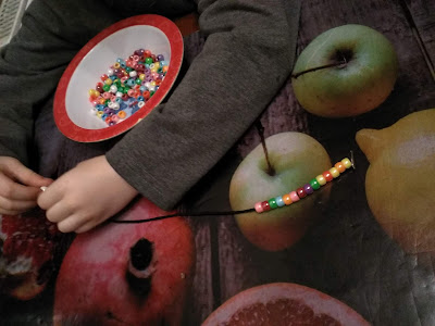 Mieliśmy w domu takie kolorowe koraliki,  a żeby je ze sobą połączyć wykorzystaliśmy gumki od starych tekturowych teczek z gumkami.