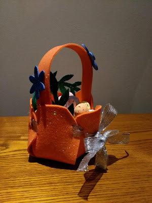 Nie jest duży, ale to dlatego, że nie chodzę do sklepów i wszelkie prace wykonujemy z tego, co nagromadziliśmy wcześniej w domu. Miałam więc coś w rodzaju filcu czy raczej gąbkowej brokatowej kartki w formacie A4 i to posłużyło nam do zrobienia koszyczka.